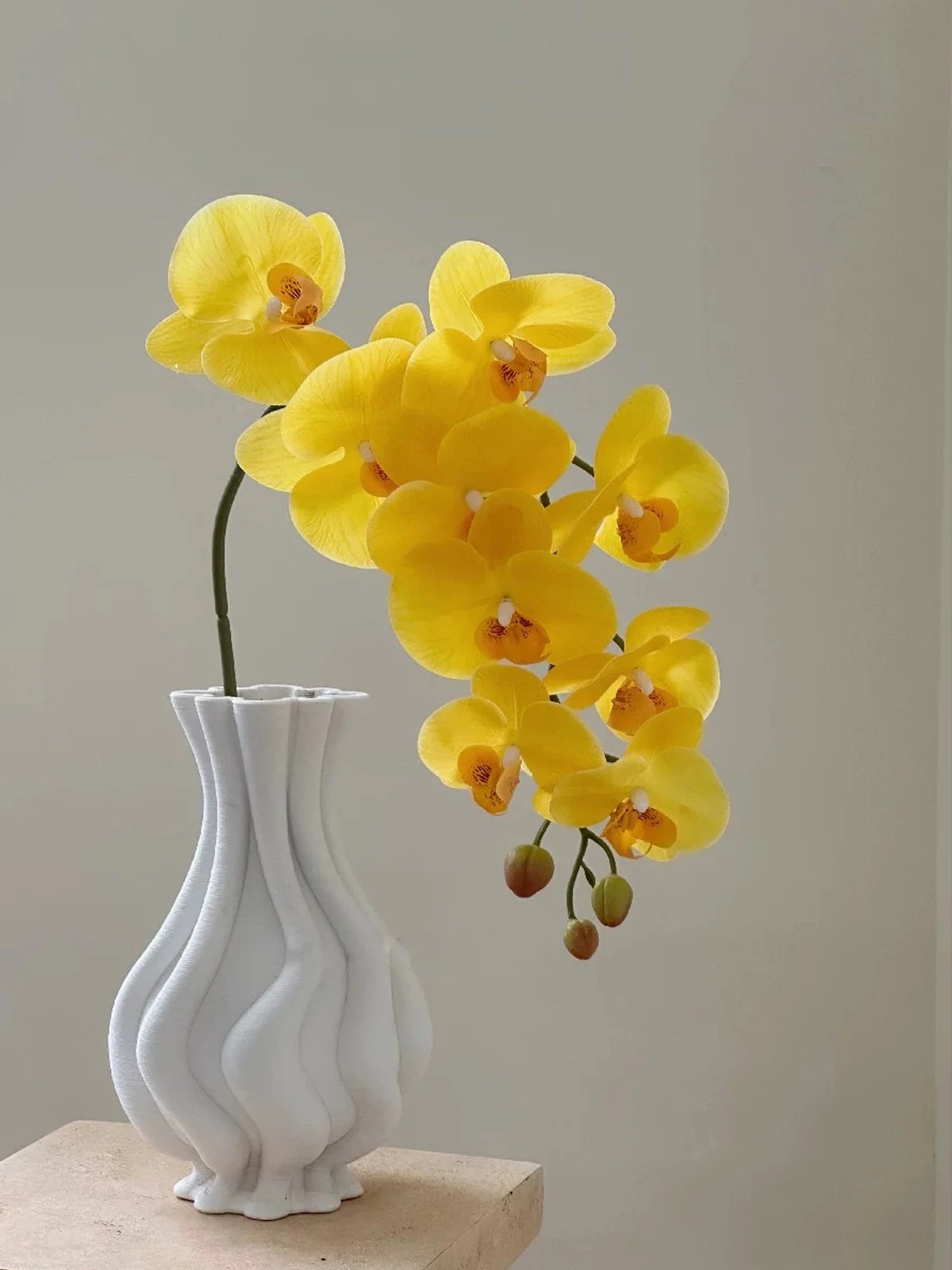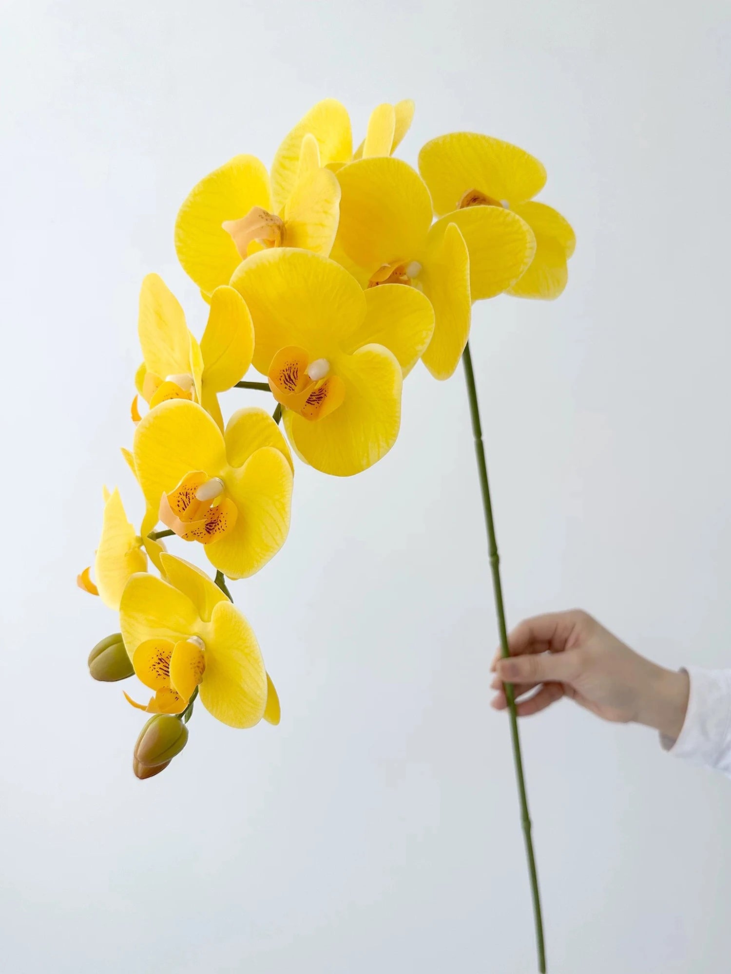 Crafted with meticulous attention to detail, the long stem white and yellow faux orchids mimic the look and feel of genuine Phalaenopsis flowers. Their sturdy construction and hyper-realistic touch mean they will look fresh for years to come, saving time and money on replacements.