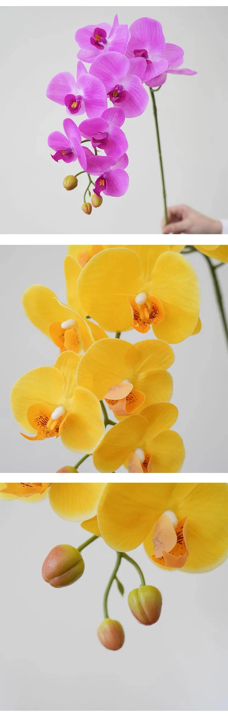 Upgrade your floral decor with this premium artificial phalaenopsis orchid.Made with soft real-touch petals and detailed veining, it looks and feels incredibly lifelike.Each stem is approx.98cm long, with a flower section of about 36cm.The flower heads measure around 8–10cm in diameter.Available in elegant white, yellow, and light purple – perfect for diy flower arrangements, home decor, weddings, and event styling.
