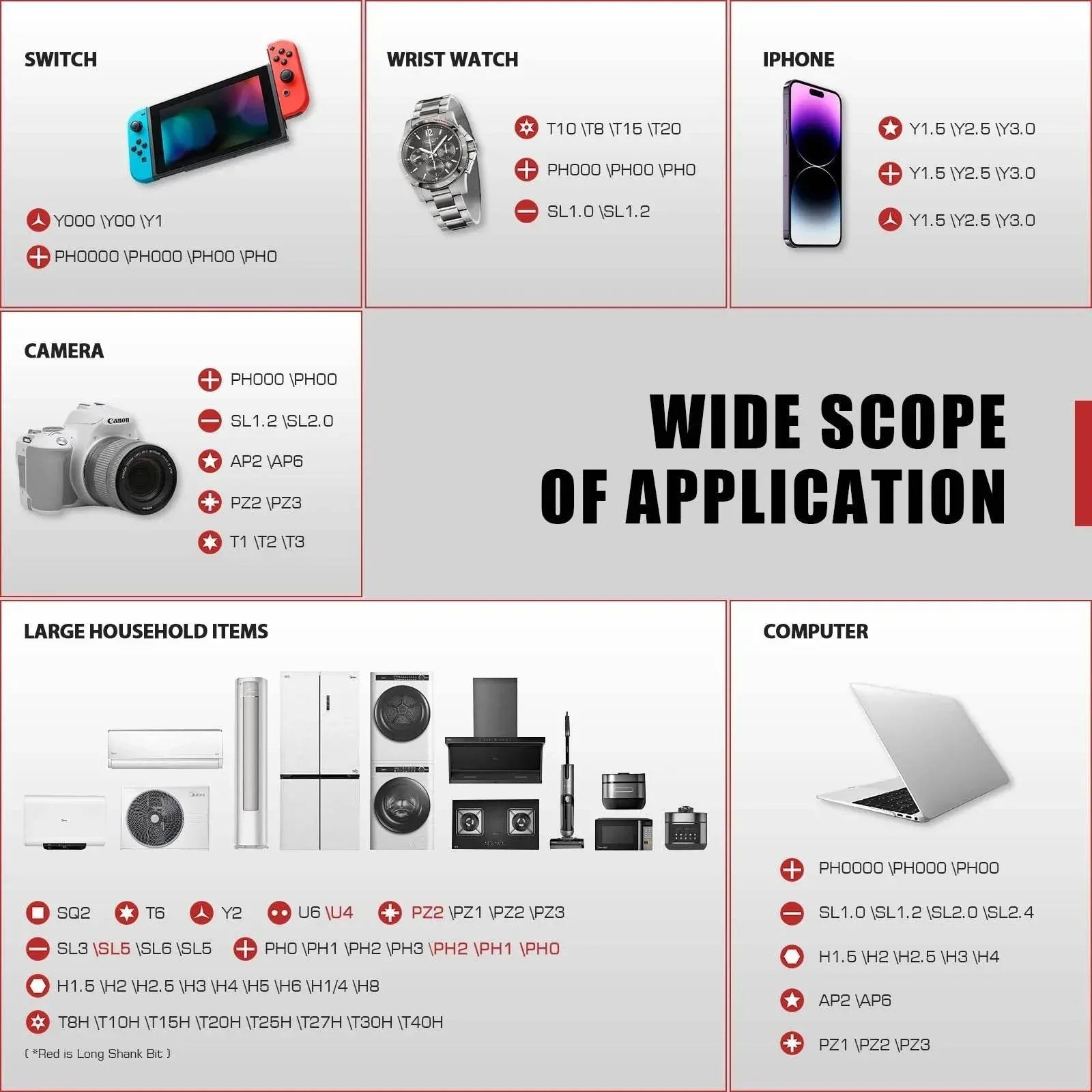 - Precision screwdriver bits in various sizes and types, including Phillips, TORX, and HEX, so you’re always equipped for any repair or assembly job—big or small.